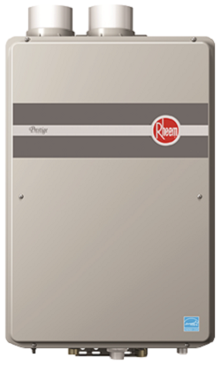 The Rheem Prestige RTGH series, including the RTGH-95DVLN Condensing Indoor Natural Gas tankless water heater, is a high efficiency inline gas powered water heating system, designed for continuous instant on and endless hot water on-demand, best in 3 - 4 bathroom homes.